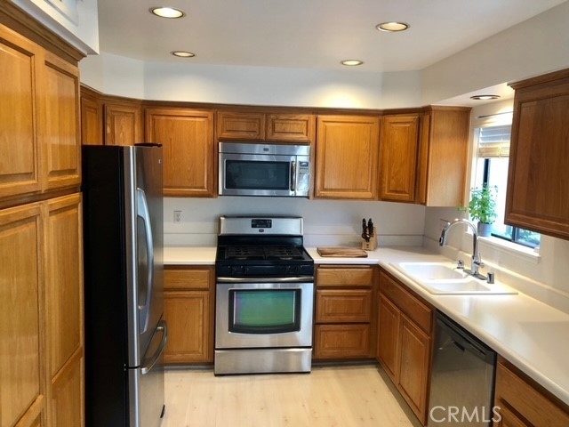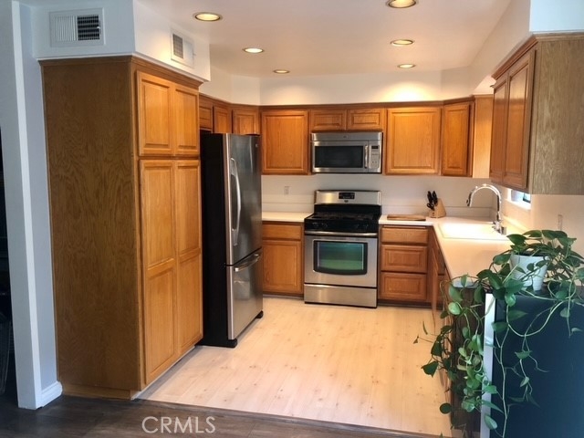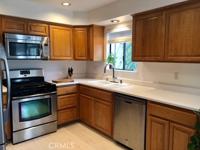 Lush, resort-style landscaping surrounds this beautiful tri-level townhome nestled in a quiet, secluded location within the highly desirable Northbrooke community. Large family room has 16 ft ceilings. Kitchen has stainless appliances and opens up to an airy remodeled dining/entertaining area. Railings have been custom stained to match the floors. Both the large master bedroom and generously sized second bedroom have private bathrooms and ample closet space. Guest powder room downstairs. Private patio offers plenty of space for grilling or relaxing. Recently updated electrical panel, water heater and AC unit. Direct access two-car garage. Community features include a pool, 3 spas, 2 tennis courts and plenty of guest parking. Centrally located to shops, schools, parks, CSUN, restaurants and everything Northridge has to offer. This unit is a must see.