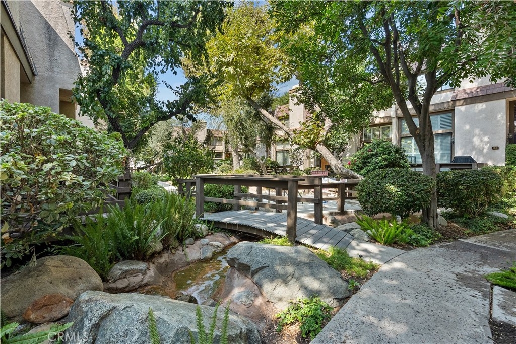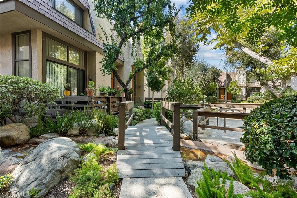 Tucked into a peaceful community where winding streams and mature landscaping create a storybook backdrop, this immaculate tri-level townhome is a rare opportunity, Offered for the first time in almost 40 years, it's more than a home it's a lifestyle of comfort, connection and tranquility. From the front porch, you'll be greeted with a spacious 1,458 sqft floor plan with a dramatic living room featuring a floor to ceiling slider and windows, where natural light streams in and frames views of the garden like grounds. The kitchen and eat in dine is both cozy and functional for everyday meals and the adjoining formal dine is ideal for hosting, celebrating or sharing Sunday dinners. Its a home that easily transitions from quiet moments to lively gatherings. Upstairs you'll find two expansive bedrooms with their own private ensuite bath - providing the ultimate in privacy. Upgraded and Updated features include shutters, recessed lighting, ceiling fans, 2024 NEW carpet, updated A/C and water heater. Attached 2 car garage with direct access housing your laundry area and water heater. Conveniently located near CSUN, shopping and public transportation.