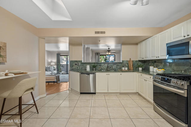 Welcome to resort-style living in the desirable Regents Court, a gated community in a prime Northridge location. This stunning 2-bedroom, 2-bathroom condo offers a bright and open floor plan spanning 1,365 square feet. The spacious main living area is defined by beautiful hardwood flooring and a striking center dual-sided fireplace that elegantly separates the living room from the dining area. The large kitchen is a chef's delight, featuring granite countertops, stainless steel appliances, durable tile flooring, skylight, a convenient breakfast bar, and ample space that could easily accommodate a breakfast table, center island or additional cabinets.This exceptional home features a dual master layout, perfect for roommates or guests. The primary master bedroom is a true retreat with a large walk-in closet and an en-suite bathroom complete with a spacious dual vanity. The secondary bedroom is also generously sized and boasts its own large walk-in closet. Both bathrooms are finished with granite counters. Enjoy seamless indoor-outdoor living on the awesome and spacious private balcony, accessible from both the living and dining rooms. Additional conveniences include an in-unit laundry closet, newer heating and air conditioning, and a secure, privately locked storage room on the same floor for invaluable extra storage.Life at Regents Court includes access to fantastic community amenities, including a sparkling pool and spa, a fitness center, and a sauna. An elevator for easy access to the third floor. This home is perfectly situated in a central Northridge location, just moments from CSUN, popular restaurants, shopping, and more.