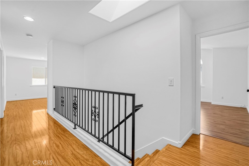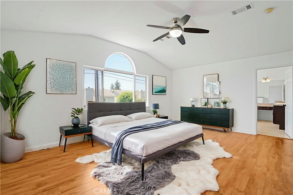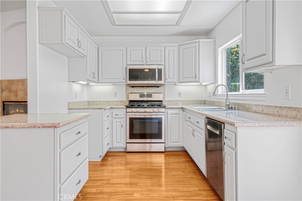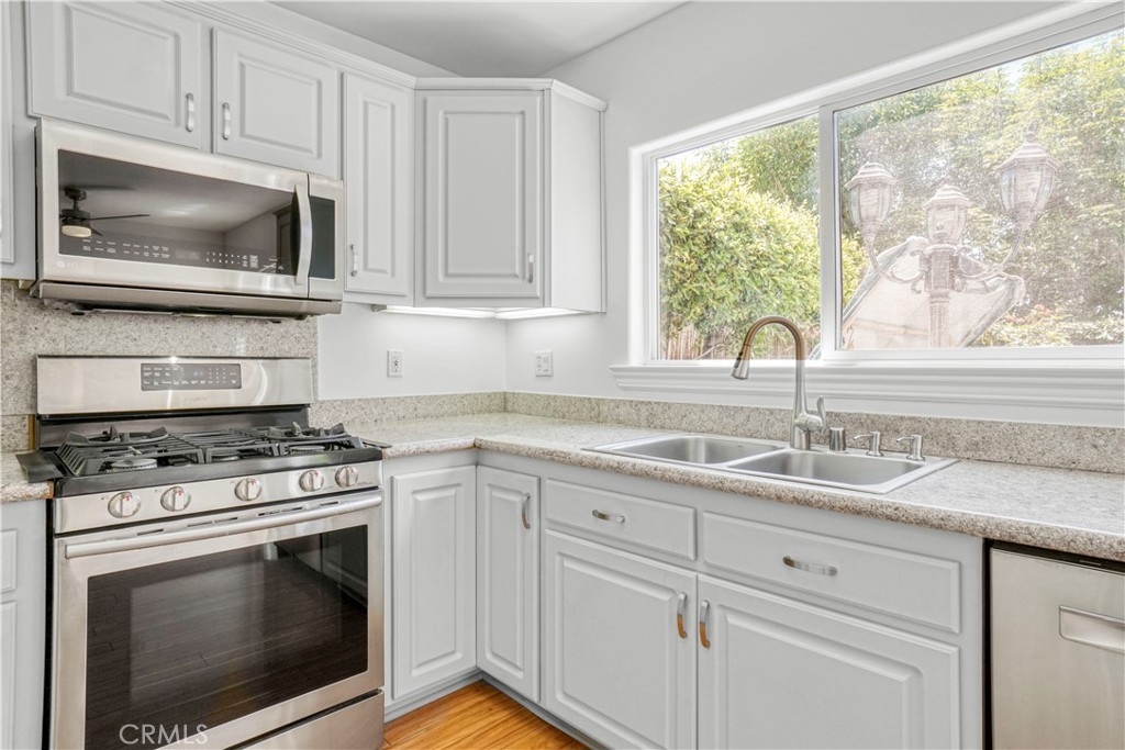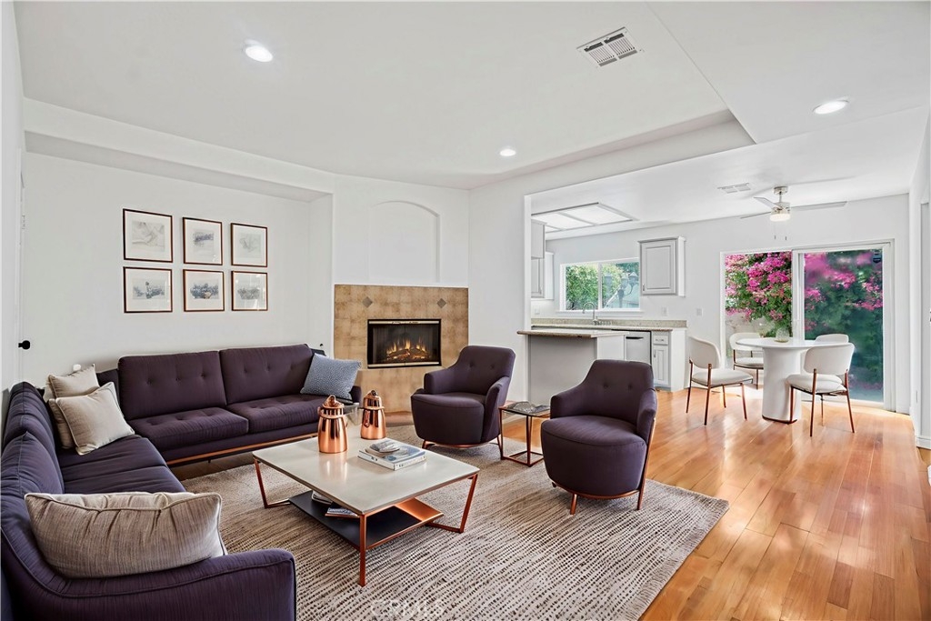 Welcome to this beautifully updated 3-bedroom, 2.5-bathroom home with a versatile loft, located in the highly sought-after gated community of Merridy Estates in Northridge. Offering 2,110 sq ft of thoughtfully designed living space, this home combines modern comfort with everyday convenience—just minutes from CSUN and centrally located in one of Northridge’s most desirable neighborhoods. Inside, you'll find a bright and spacious layout featuring high ceilings and an abundance of natural light. The main level includes a separate living room, cozy family room with gas fireplace, formal dining area, breakfast nook, and a convenient powder room. The recently remodeled kitchen boasts granite countertops, stainless steel appliances, a 5-burner gas stove, and a charming bay window that fills the space with light. Upstairs, the expansive primary suite offers soaring ceilings, large windows, and a peaceful retreat. It features a spacious walk-in closet and a luxurious en-suite bathroom complete with dual sinks, a dedicated makeup vanity, a jetted soaking tub, and a stand-up shower with a built-in sitting ledge. Down the hall are two additional generously sized bedrooms, a remodeled full bathroom with dual vanities, and a versatile loft that can serve as a home office, media room, or play area. Recent upgrades include new upstairs flooring, fresh interior paint, new door hardware, a recently replaced HVAC unit, and solar panels to help reduce energy costs and improve efficiency. Additional features include dual-pane windows and a 2-car attached garage with built-in storage cabinets, an EV charger, and a dedicated laundry area. The backyard is spacious yet low maintenance—perfect for entertaining or relaxing outdoors. Located in the gated community of Merridy Estates, residents enjoy low HOA dues that include earthquake insurance, front yard and common area maintenance, a security camera system, and gated entry. Built in 2001 and move-in ready, this home offers comfort, sustainability, and an unbeatable location in the heart of Northridge.