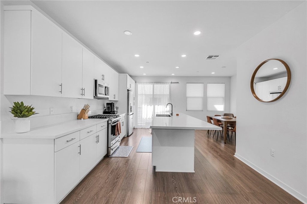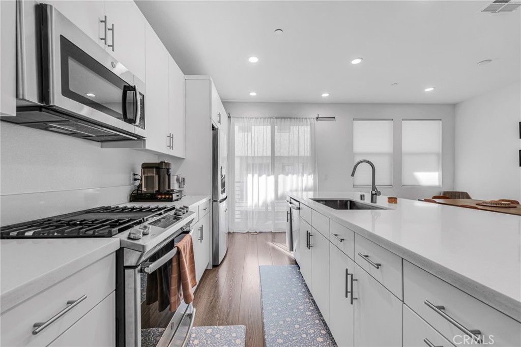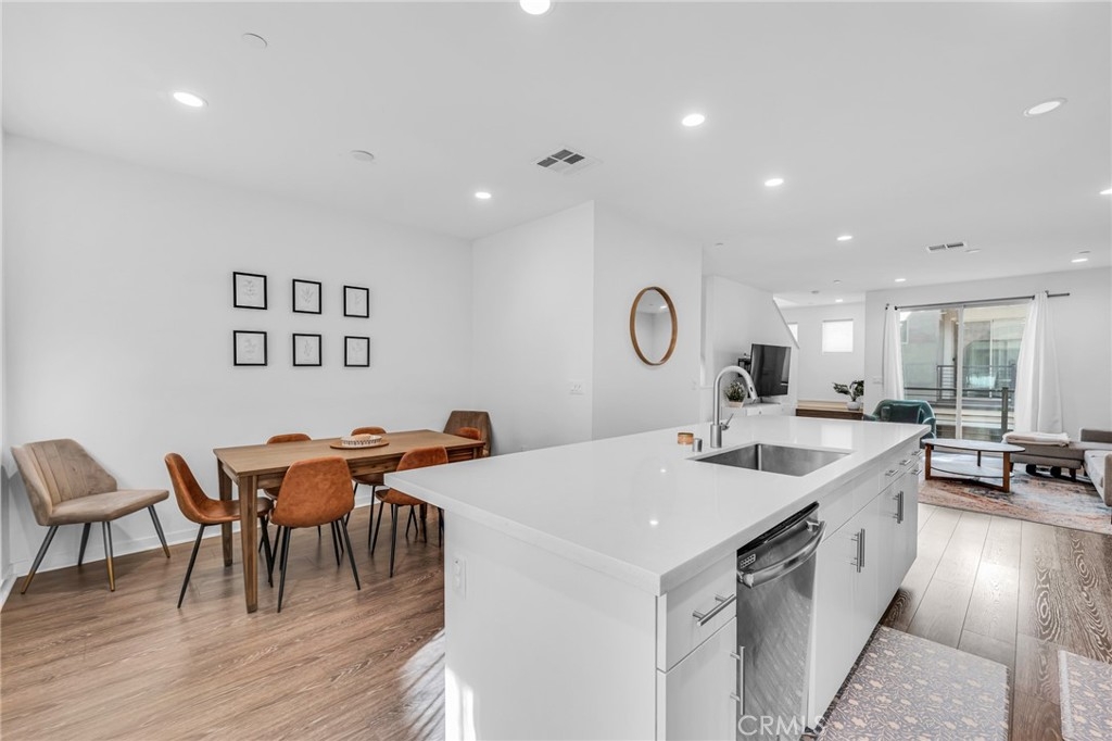 Welcome to this stunning 4-bedroom, 4-bath townhome, offering over 1,850 square feet of thoughtfully designed living space. This modern residence is perfect for those seeking comfort, convenience and style. The main level is a light-filled, open-concept living, kitchen and dining area. The sleek kitchen boasts crisp white cabinetry, quartz countertops, and stainless steel appliances, making it both functional and stylish for cooking or entertaining. The oversized island doubles as a breakfast bar and offers plenty of workspace. Adjacent, the dining area and spacious living room create a seamless flow for gatherings or relaxation, with sliding glass doors leading to your private outdoor space. The primary bedroom features an en-suite bathroom, offering a tranquil retreat with a large vanity and walk-in shower. The additional three bedrooms are generously sized, with ample closet space and contemporary finishes. For added convenience, the home includes in-unit laundry and a direct-access 2-car garage. Community highlights include a sparkling pool with lounging areas, perfect for enjoying sunny California days. The home is situated within a mile of an array of amenities, including popular shops, restaurants, and entertainment options like Northridge Fashion Center, Target, and Trader Joe's. The neighborhood also offers parks, fitness centers, and excellent schools, making this a prime location. Don’t miss the opportunity to make this exceptional townhome your new home!