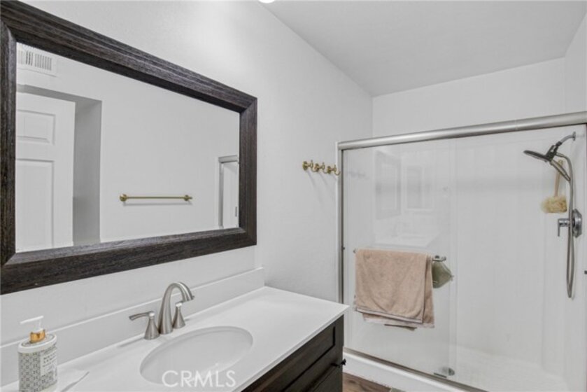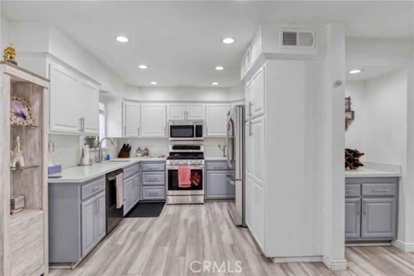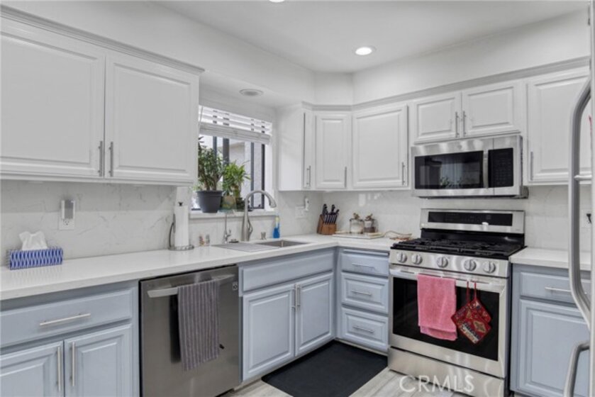 Welcome to this stunning tri-level townhome in the coveted Northbrook community, offering 2 bedrooms, 2.5 bathrooms. The living room impresses with floor-to-ceiling windows, recessed lighting, and laminate flooring, all overlooking lush greenbelt views. A private patio. The beautifully remodeled kitchen boasts Quartz countertops, stainless steel appliances, ample cabinetry, and an upgraded wet bar. The formal dining area provides plenty of seating, with a nearby powder room for guests. Upstairs, the spacious primary suite features a walk-in closet, recessed lighting. The second bedroom includes its own private bath. The attached two-car garage offers direct access, storage cabinets, laundry hookups, The HOA includes water and sewer, earthquake insurance, 24-hr security. This unit includes a spacious two-car garage with direct access to the home. Residents have access to a large swimming pool, tennis court, and peaceful water streams running throughout the area.