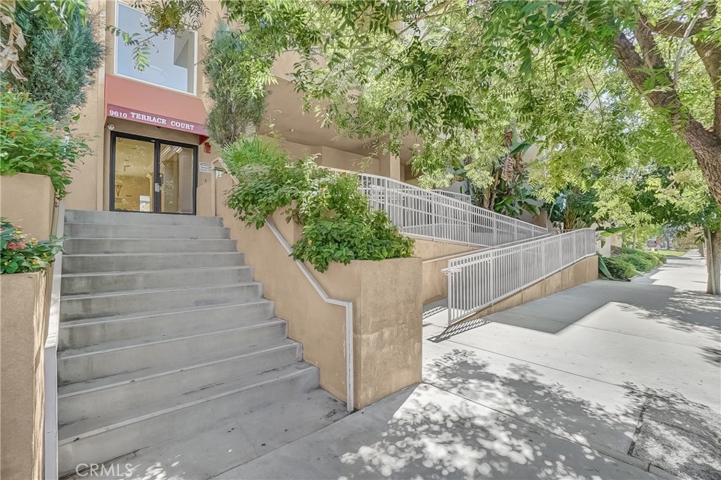 Fantastic Northridge location across the street from the CSUN campus and high school! End unit with only one common wall in back of building. 3 bedroom 3 bath one level design. Kitchen with granite counters, shaker style maple cabinets, recessed lighting, wood floor, and stainless appliances includes fridge. Formal dining, and a living room with crown molding opens to patio. Master separate from secondary bedrooms, includes generous sized walk-in closet. Master bath has vanity w/ 2 basins, tub and stall shower. Includes washer/dryer in unit. Wood blind window covers, programmable thermostat. Community pool, fitness center, BBQ area, and courtyard with planters. Elevator from gated parking to entry level. Patio facing North. Close to shops, restaurants and the 118 freeway.